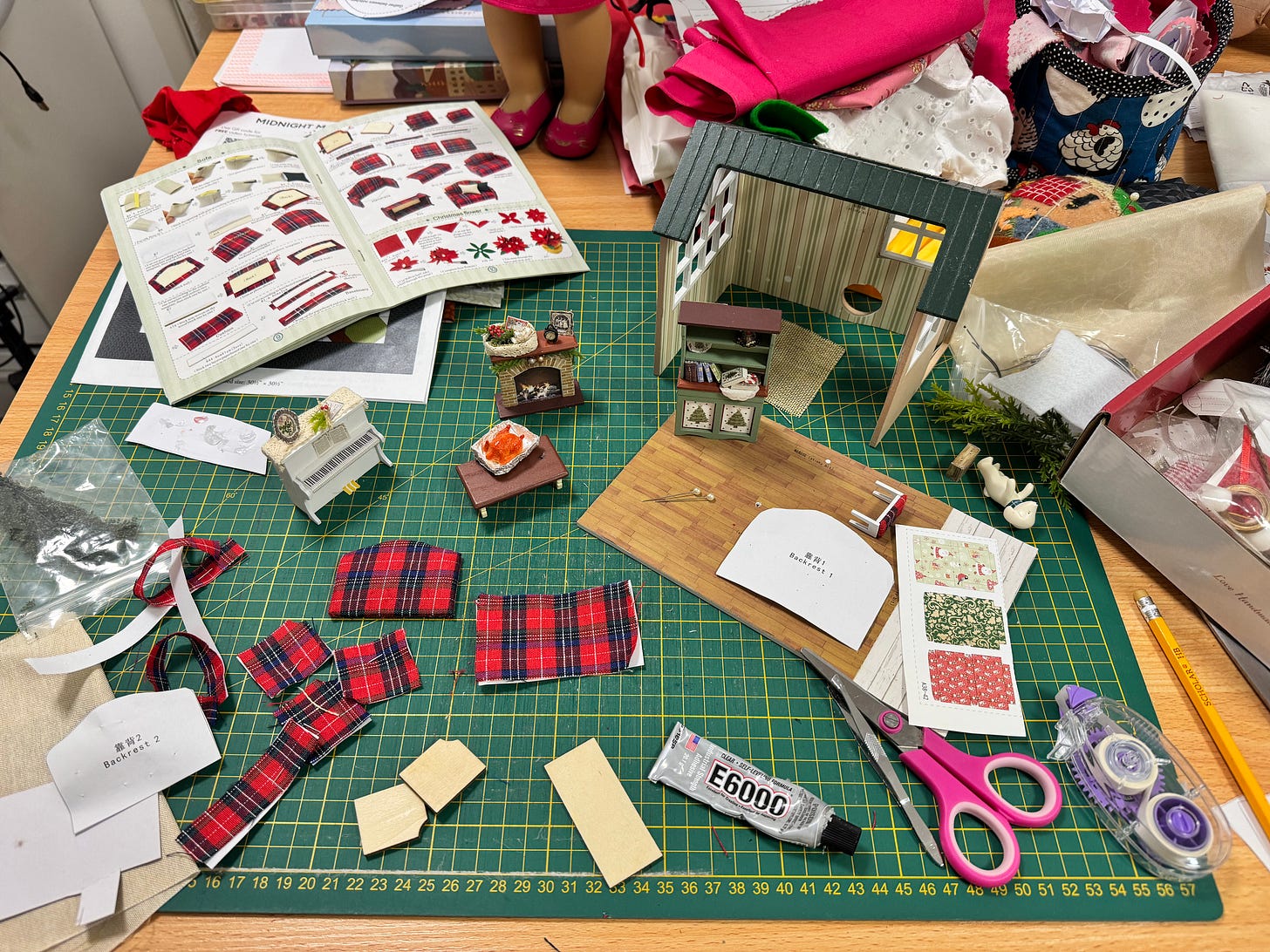 As I am writing this newsletter a few days before I publish, I have my tiny room model spread out on my table. It is so detailed and fiddly. You have to glue together every little thing such as all the lounge pieces that you can see in the front. Even the tiny green branches have to have the teeny red balls glued on the make them look like holly. It is a Christmas scene.